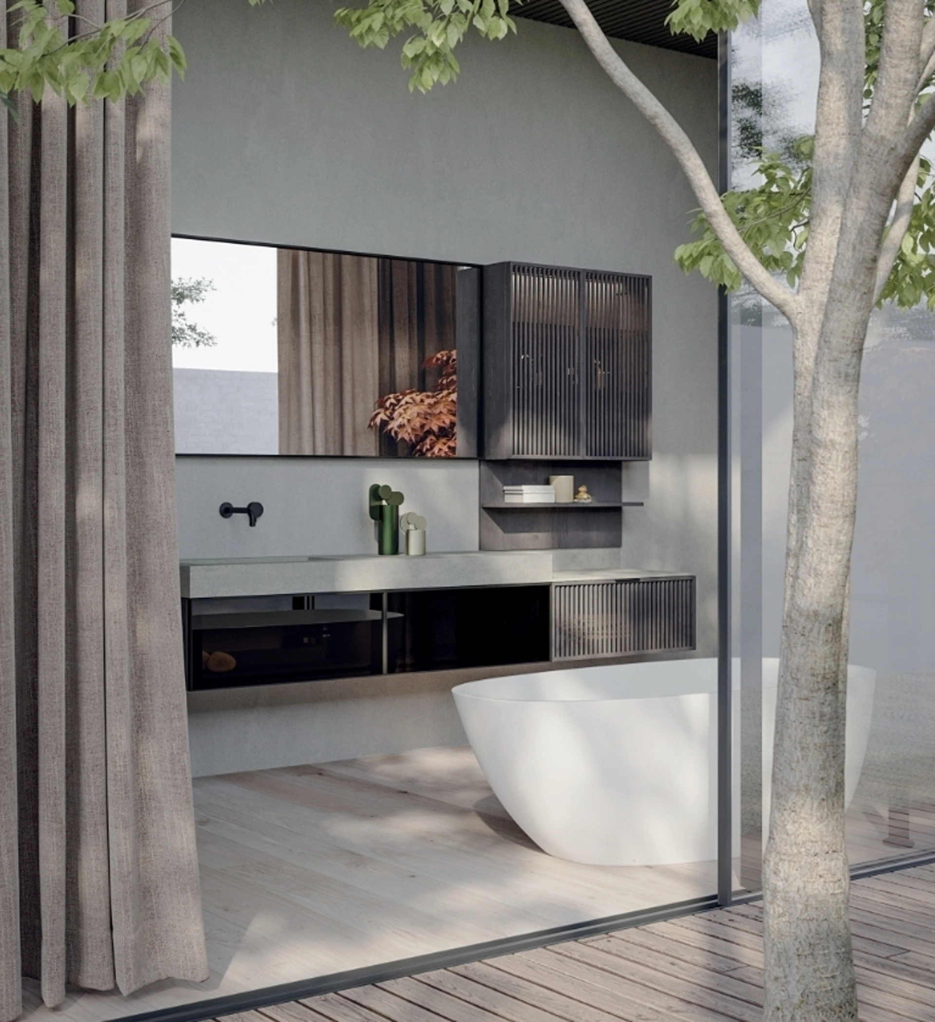 Scopri di più sull'arredo bagno design: mobili bagno sospesi in vetro come il modello Quari New 01 di Novello ti attendono.