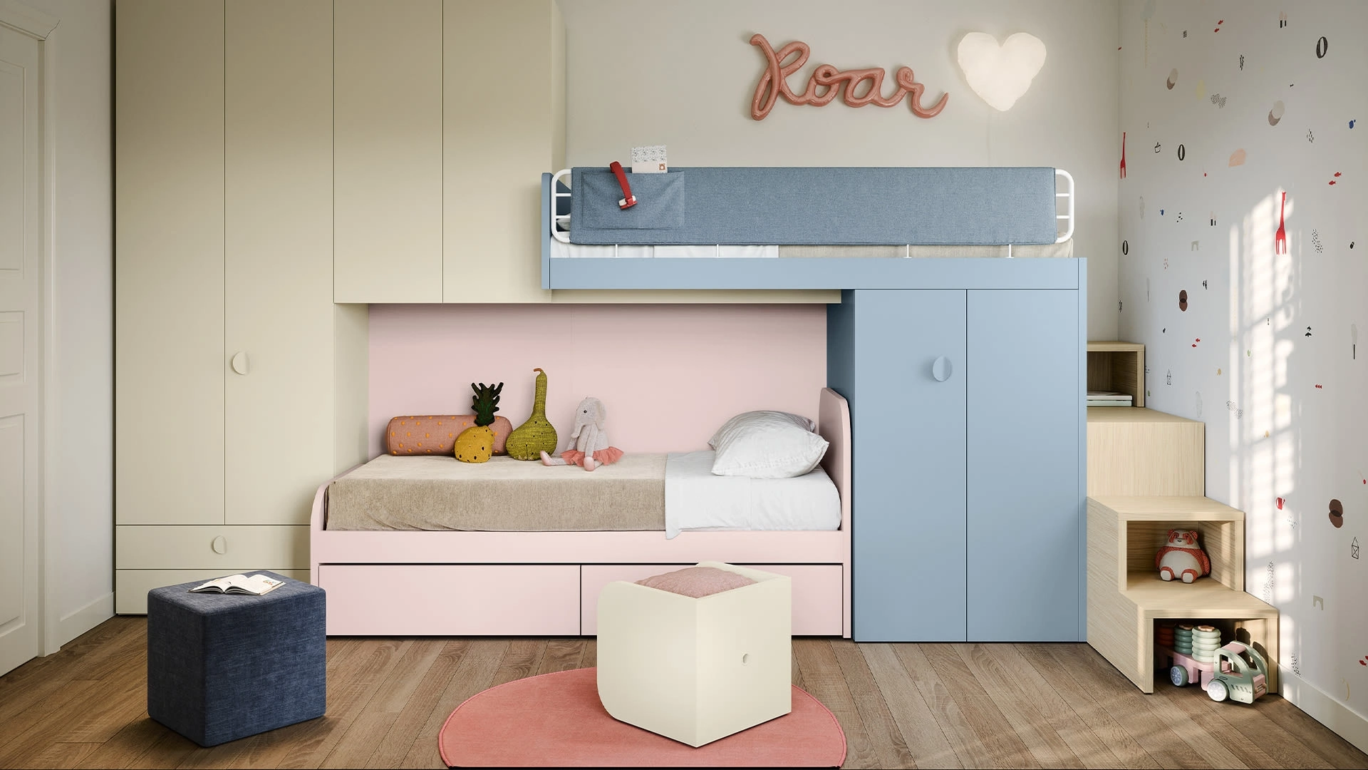 Con questa cameretta Soppalco Nidi, tra le soluzioni a soppalco, potrai allestire stanze moderne per bambine.
