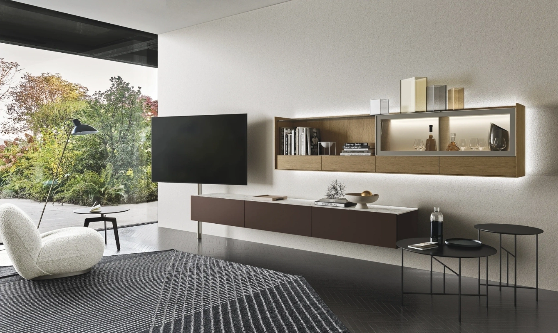 Vuoi ammobiliare un soggiorno operativo e pratico? Ecco a te la parete attrezzata Cabaret Glass 01 Sangiacomo dalle linee decise moderne.
